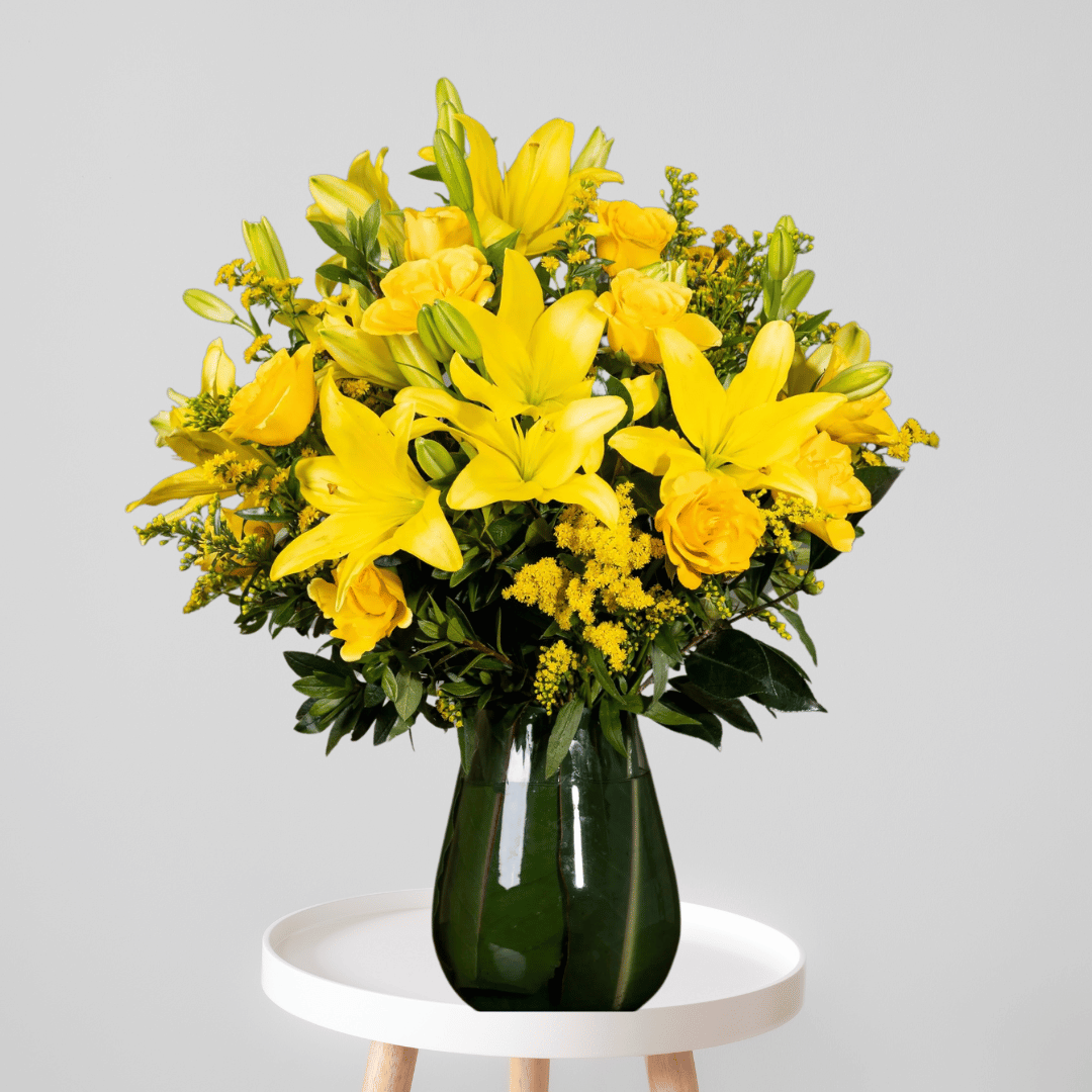 Yellow lilies with yellow roses and foliage.